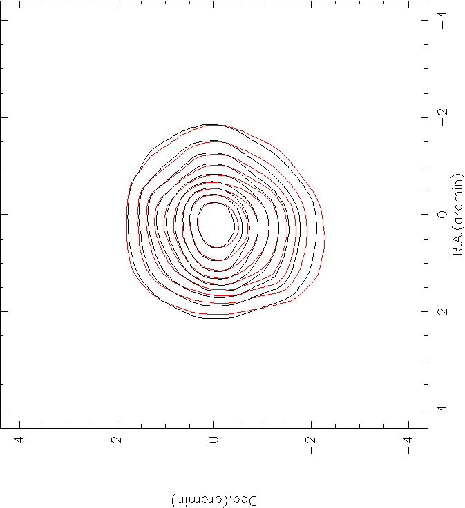 Right panel: S269 (RA: 06h14m36.01s, DEC: 13d49m44.2s, EPOCH: 2000.0) water maser OTF observation results. Red contour is the scan along the longitude, black contour is the scan along the latitude.