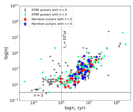 Using the NSRT, the researchers have detected glitches in PSRs J1722-3632, J1852-0635 and J1957 + 2831. This is the first time to report glitches in the first two pulsars. PSR J1722-3632 is the second old pulsar which shows large glitches. It is found that there is a strong correlation between the absolute value of the braking index and the characteristic age for the middle-age pulsars in which the numbers of positive and negative values of the braking index are almost equal. However, there is no correlation between the braking index and the characteristic age for young pulsars in which the braking index is almost always positive. The results provide an important samples for the study of pulsar spin evolution and internal physics.
