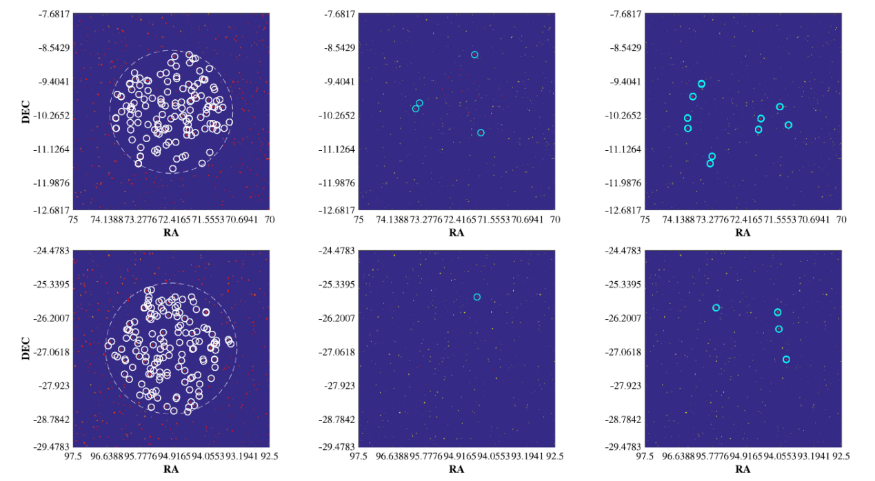 Fig.1 Mosaics“R15D26”and“R20D15”. Left:catalog sources (white circles) and detected sources (tiny red rectangles). Middle:false detection and discovery detection. Right:missing detection.