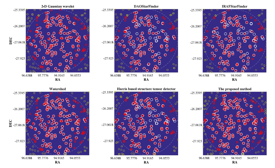Fig.2 Comparisons among methods about mosaic “R20D15”. White circles (catalog sources) and red circles (detected sources).
