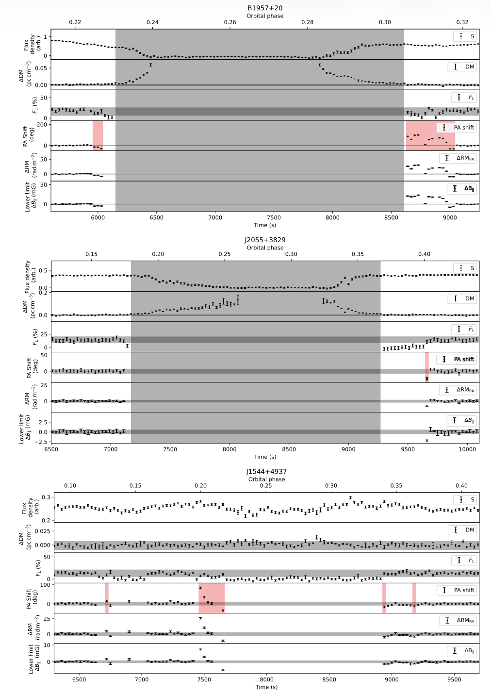 Figure 1: The polarization properties of PSRs B1957+20, J2055+3829, and J1544+4937 versus orbital phases.