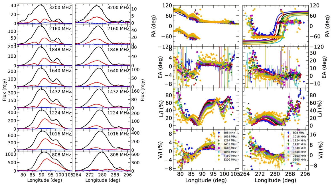 Recently, Ph.D. student WANG Zhen from the pulsar research group of Xinjiang Astronomical Observatory (XAO), Chinese Academy of Sciences (CAS), under the guidance of his supervisors, Prof. YUAN Jianping and Prof. WEN Zhigang, utilized the Murriyang (Parkes) 64-meter radio telescope in Australia equipped with an ultra-wideband receiver. For the first time, they captured the complete polarization pattern of this millisecond pulsar's main pulse and interpulse as they vary with frequency.