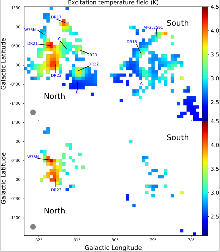 Furthermore, the ortho-H₂CO (1₁,₀–1₁,₁) transition demonstrates remarkable sensitivity to the physical environment of molecular clouds, revealing their internal conditions. The researchers determined that the optical depth of this transition ranges from 0.06 to 0.69 (mean 0.19), while the total column density varies from 0.10 × 10¹⁵ cm⁻² to 7.38 × 10¹⁶ cm⁻² (average ∼8.67 × 10¹⁵ cm⁻²). These parameters clearly delineate all star-forming activity regions within the Cygnus-X complex.