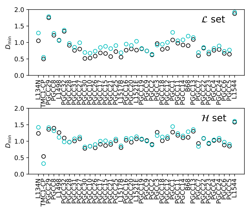 Figure 1:The agreements between model and the sample。Black--without PAHs;cyan- with PAHs. The upper and lower panels are for the models with low (L) and high (H) metal initial abundances to the models respectively.
