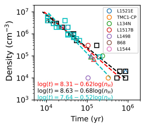 Figure 2:The correlation between the fitted chemical age and gas density by fitting the sample. The black, cyan and red dashed lines are for the fitted results from the models without, with PAHs and the combined sample of the former two.