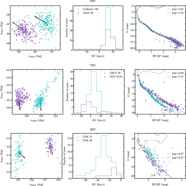 Fig 1. Representative types of binary clusters. Panels show the spatial distributions (left), radial velocity (middle), and the color–magnitude diagram (right). Arrows indicate the clusters’ tangential velocities.